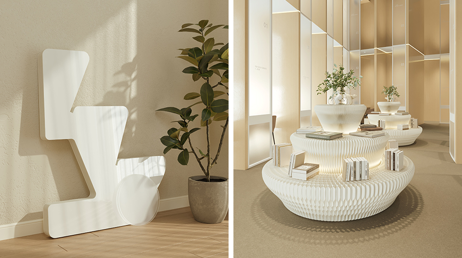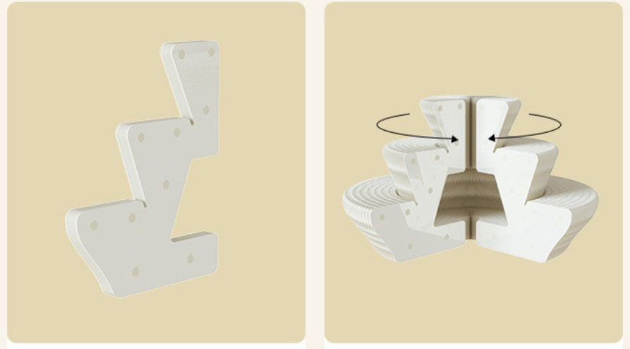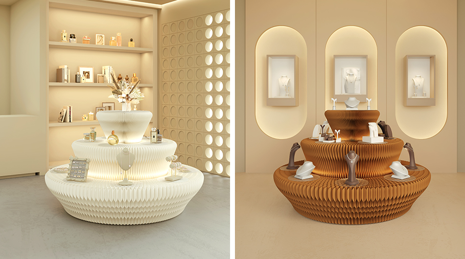 DESCRIPTION: The circular display stand is crafted from long-fiber virgin kraft pulp and manufactured with a honeycomb hexagonal structure. For use, simply stretch out the two side panels to form a circle, then attach the Velcro strips on them together. Adding colorful light strips will enhance the artistic ambiance of your products. When not in use, just open the two side panels and fold the stand down to the thickness of a book, making it easy to carry and store.