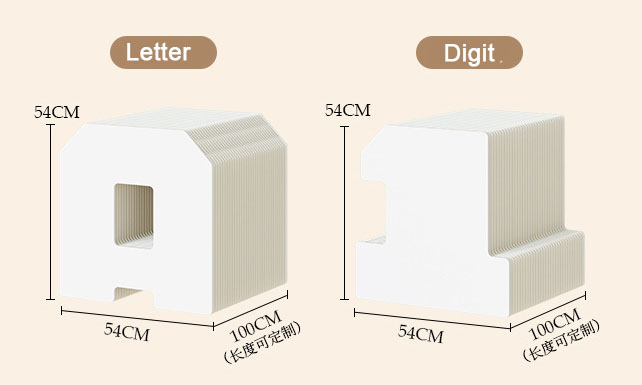 DESCRIPTION: The letter or number display stand is made of high-quality long-fiber virgin pulp kraft paper and processed with a honeycomb hexagonal structure. It features an accordion-shaped appearance and is easy to assemble, place, fold and store. Its shape can be customized according to customer needs (e.g., LOGO, Brand), and it can be placed freely in various customer scenarios in forms such as linear, S-shaped, U-shaped and more.