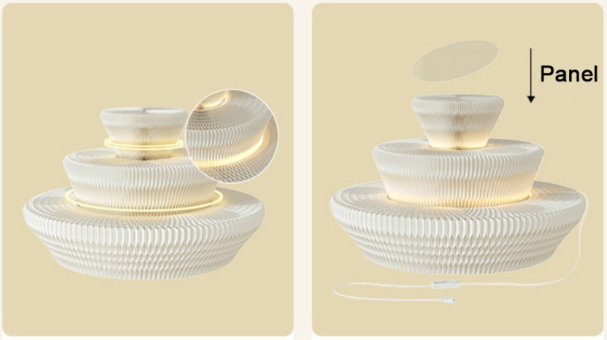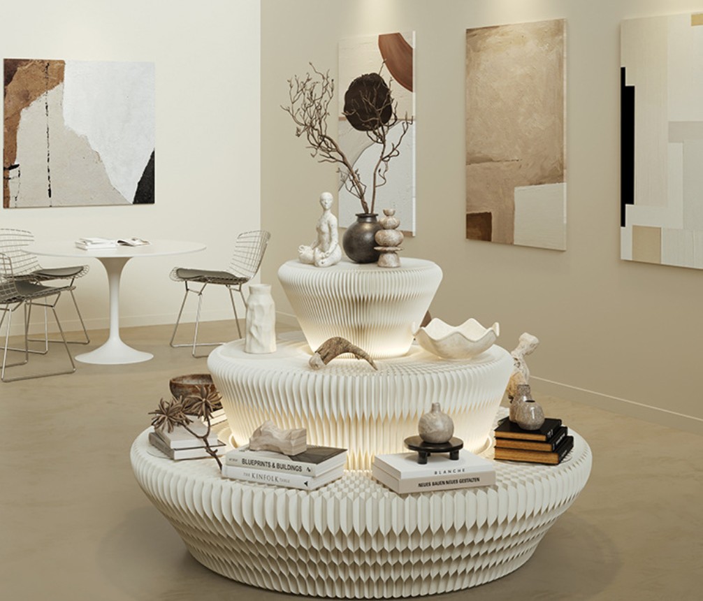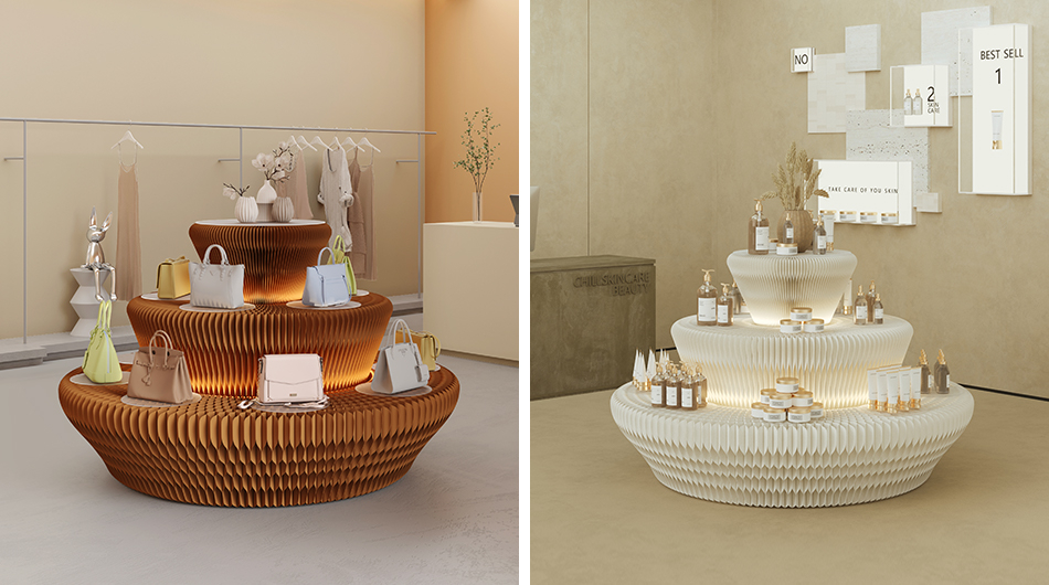 DESCRIPTION: The circular display stand is crafted from long-fiber virgin kraft pulp and manufactured with a honeycomb hexagonal structure. For use, simply stretch out the two side panels to form a circle, then attach the Velcro strips on them together. Adding colorful light strips will enhance the artistic ambiance of your products. When not in use, just open the two side panels and fold the stand down to the thickness of a book, making it easy to carry and store.