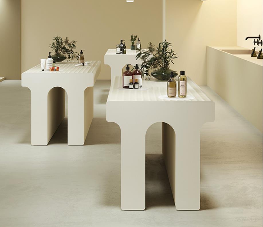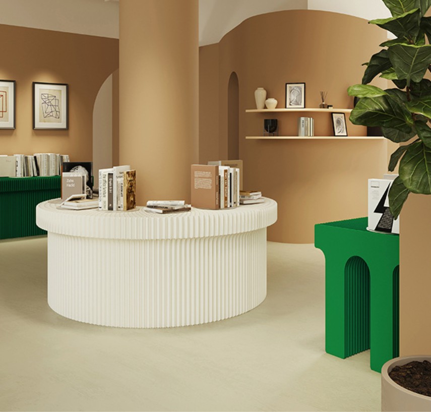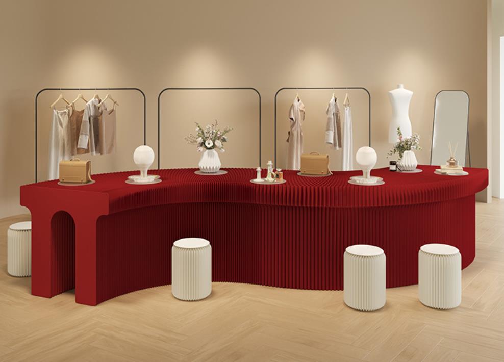DESCRIPTION: The Arch Shape Kraft Paper Display Stand is made of high-quality long-fiber virgin pulp kraft paper and processed with a honeycomb hexagonal structure. It features an accordion-shaped appearance and is easy to assemble, place, fold and store. Its shape can be customized according to customer needs (e.g., LOGO, Brand), and it can be placed freely in various customer scenarios in forms such as linear, S-shaped, U-shaped and more.