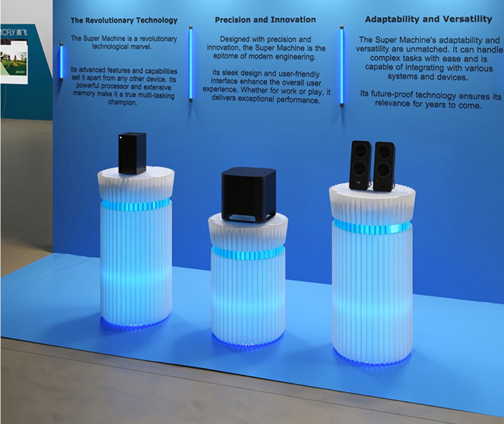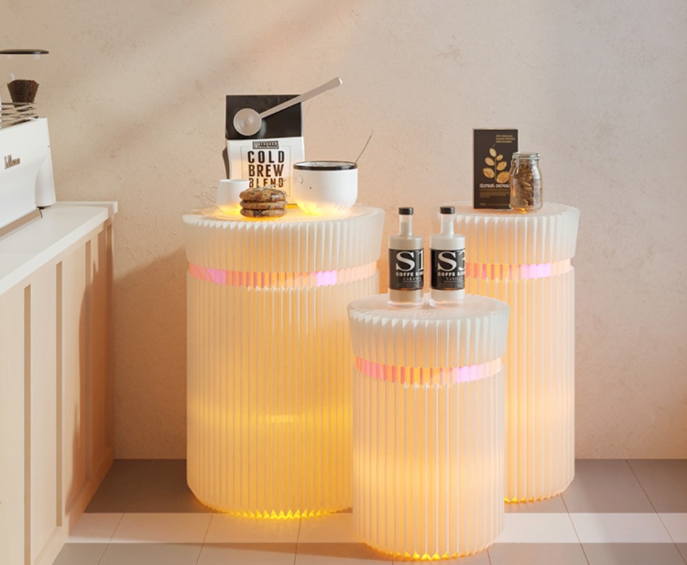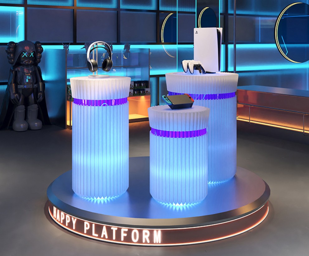 DESCRIPTION: This iridescent display stand is crafted from long-fiber kraft paper and processed with a honeycomb hexagonal structure. It comes with colored light strips, which render the entire display stand stunning and elevate the product's aesthetic appeal. The accordion-style paper design allows for easy folding, moving, assembly and storage of the stand.